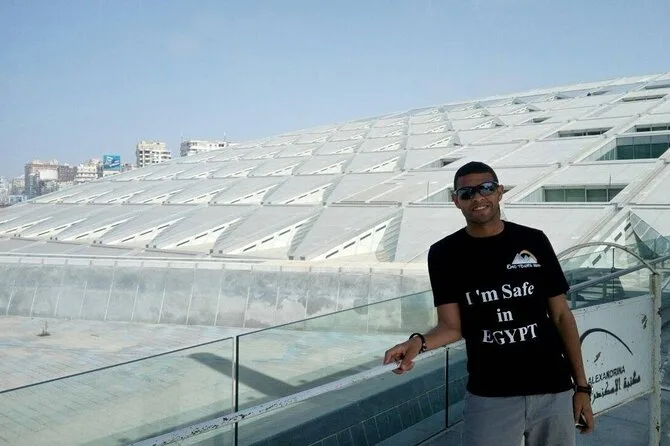 Ti sei mai chiesto cosa si prova a stare dove la città di Alessandro incontra il Mediterraneo? Non sapevo bene cosa aspettarmi da un tour privato di un giorno ad Alessandria — forse solo vecchie pietre e qualche racconto. Ma appena la nostra guida, Hossam, ci ha preso (con quel sorriso spontaneo), la città ha cominciato a sentirsi più viva di quanto immaginassi. Anche l’aria fuori dall’hotel era diversa — salmastra, mescolata a un leggero odore di gasolio e pane fresco dalla panetteria di fronte. La prima tappa è stata la Biblioteca di Alessandria. È enorme. Ovunque c’erano bambini delle scuole che chiacchieravano in arabo e francese. Quel giorno (venerdì) la biblioteca era chiusa, così abbiamo fatto solo qualche foto fuori — e devo ammettere che mi ha fatto sorridere, perché non vedevo l’ora di entrare, ma Hossam ha scrollato le spalle e ha detto: “Questa è Alessandria, sempre una sorpresa.”