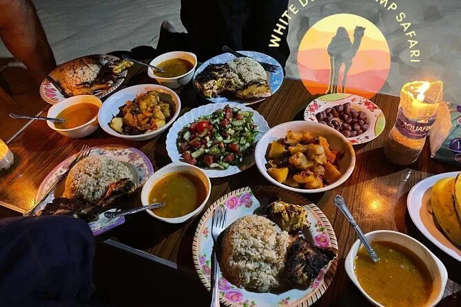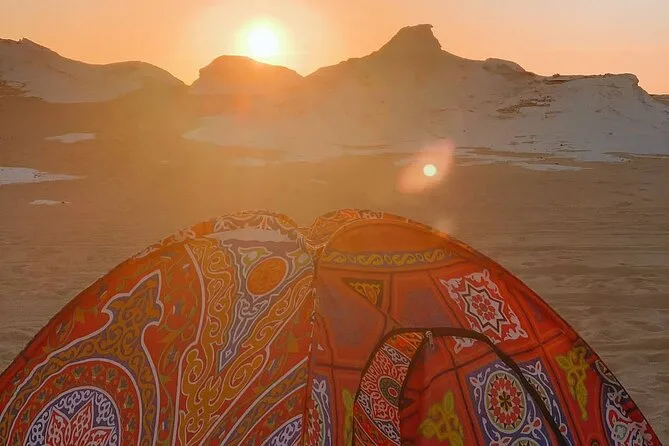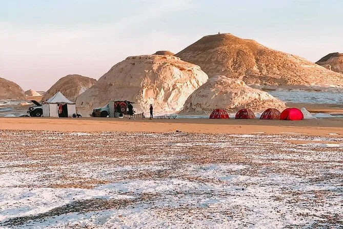 I tuoi tre giorni includono trasporto privato in 4x4 dal Bahariya Oasis con guida beduina che parla inglese; due notti in campeggio con tende, materassi e sacchi a pelo forniti; tutti i pasti — colazioni cucinate sul fuoco, pranzi e cene (con bevande analcoliche); visite al Deserto Nero, sorgenti termali, Montagna di Cristallo, Valle di Agabat per il primo campeggio; poi avventure sulle dune con sandboarding e infine esplorazione delle parti vecchia e nuova del Deserto Bianco per l’ultima notte sotto un cielo stellato unico.