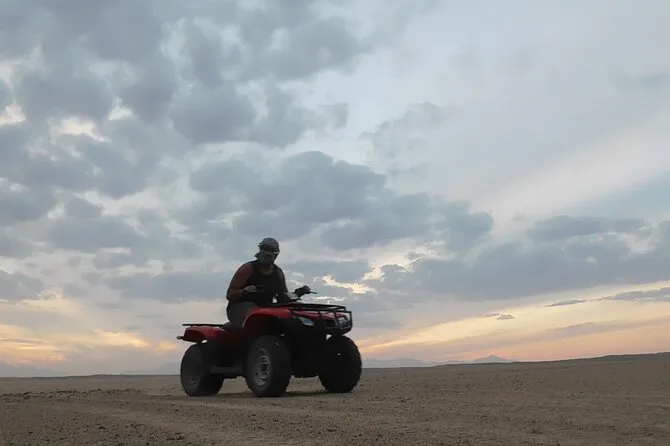 Non mi aspettavo di sentirmi così piccolo laggiù — non in senso negativo, ma come se il deserto avesse un suo ritmo lento e profondo. Ci hanno preso direttamente dall’hotel a El Gouna (ero ancora mezzo addormentato), poi abbiamo incontrato la guida al motor park. Aveva un sorriso tranquillo e ci ha spiegato come guidare i quad — ero un po’ nervoso, ma lui ha fatto sembrare tutto semplice. Il primo rombo del motore sotto le mani è stato stranamente emozionante.