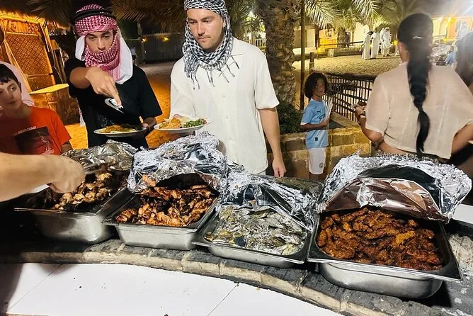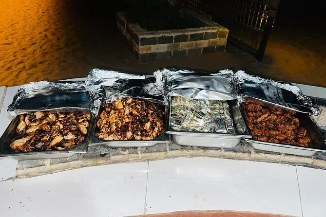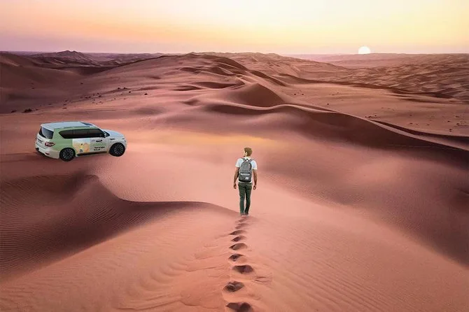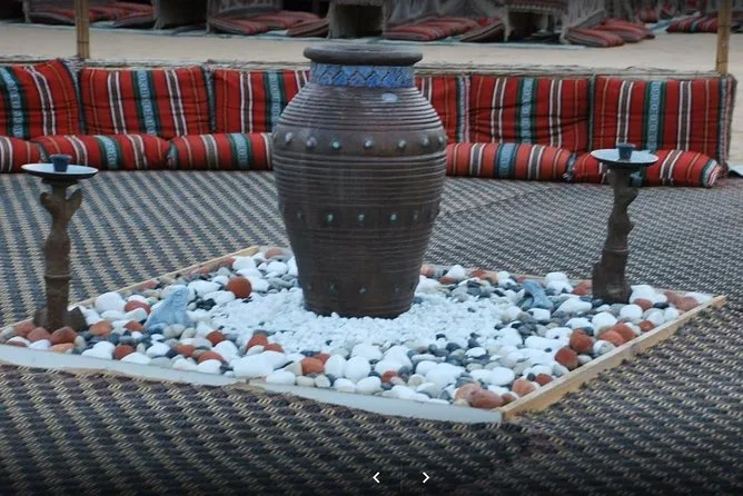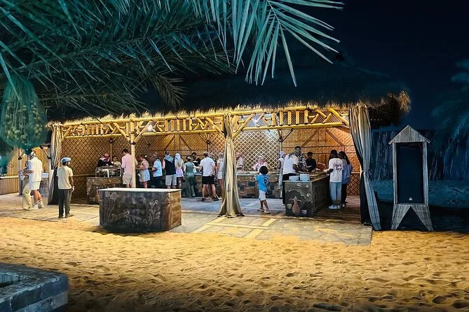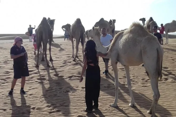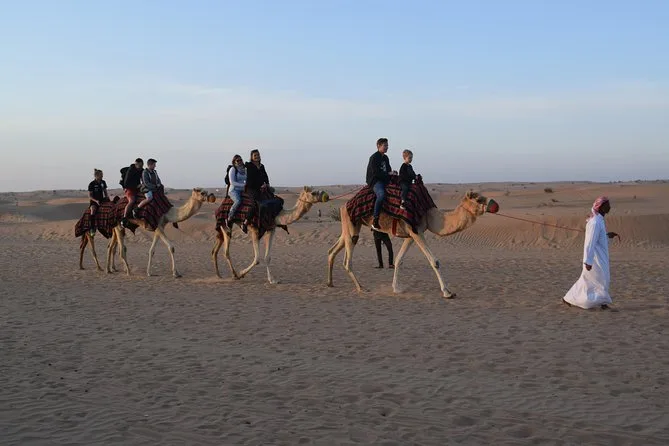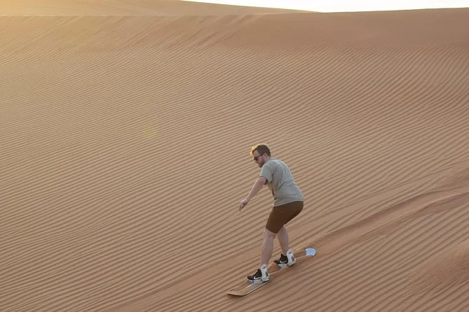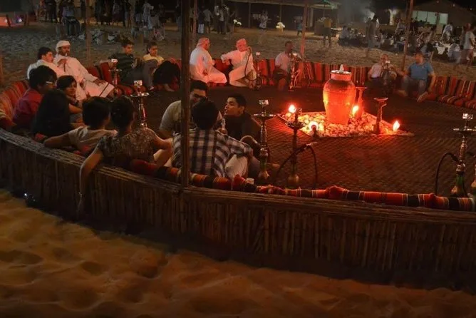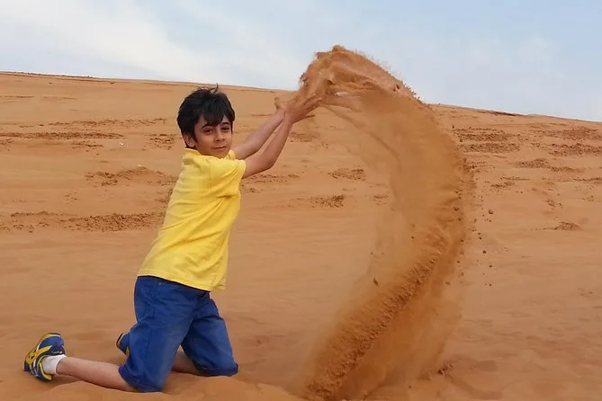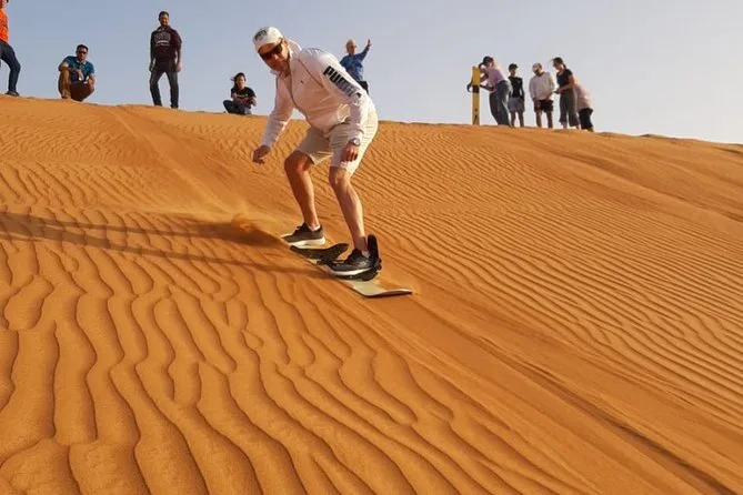 Dune bashing in 4x4, sandboarding, breve giro in cammello, pittura henné, shisha, costumi tradizionali per foto, cena BBQ a buffet con spettacoli dal vivo.