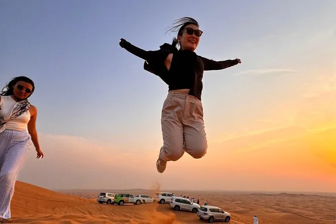 La tua serata include il pickup a domicilio con SUV 4x4 climatizzato da qualsiasi punto di Dubai o Sharjah, dune bashing guidato nel deserto di Lahbab con autista-guida in inglese, un tranquillo giro in cammello sulle sabbie dorate, sandboarding per i più coraggiosi, caffè arabo con datteri all’arrivo al campo, pittura tradizionale con henné per le donne, bevande analcoliche illimitate e acqua per tutta la notte più una cena BBQ a buffet con opzioni vegetariane e non, il tutto accompagnato da spettacoli dal vivo prima del rientro in hotel.