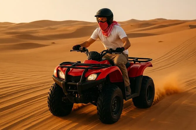 Il tuo giorno include il pick-up diretto dal tuo hotel a Dubai (o Sharjah/Ajman), trasferimento condiviso in Land Cruiser climatizzato con guida, 30 minuti di quad nel deserto rosso di Lehbab seguiti da dune bashing e sandboarding. Al campo potrai fare giri in cammello, tatuaggi di henné se vuoi, tè/caffè/bevande analcoliche illimitate e accesso alla shisha nell’area bar prima di goderti una cena BBQ a buffet con opzioni vegetariane, mentre assisti a cinque spettacoli dal vivo sotto il cielo stellato del deserto—poi il rientro in hotel a tarda sera.