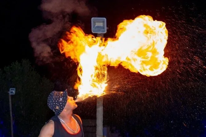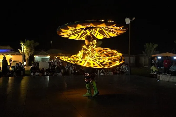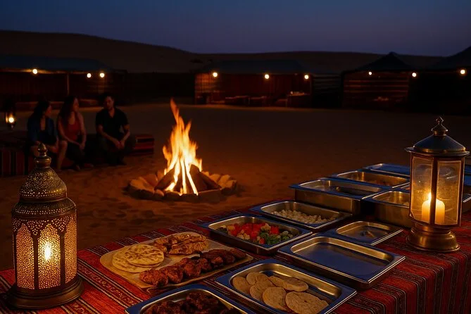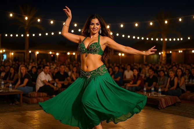 Siamo arrivati al campo proprio quando la luce diventava dorata. Si sentiva l’odore di carbone e spezie — qualcuno stava già grigliando per la cena BBQ. L’atmosfera era vivace ma senza confusione: bambini con tatuaggi di henné, persone in fila per la shisha o che provavano i coloratissimi costumi arabi per le foto. Alla fine mi sono ritrovato con un falco appollaiato goffamente sul braccio (il maneggiatore mi ha fatto l’occhiolino, sapeva che ero un po’ nervoso). Poi sono iniziati gli spettacoli dal vivo — musica e danze sotto un cielo enorme, più vasto di qualsiasi soffitto a casa. Il cibo era molto meglio di quanto mi aspettassi; anche le opzioni vegetariane avevano un sapore vero. C’è qualcosa di speciale nel mangiare all’aperto dopo una giornata così — ti rimane dentro.