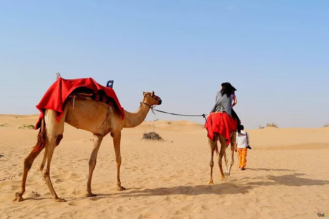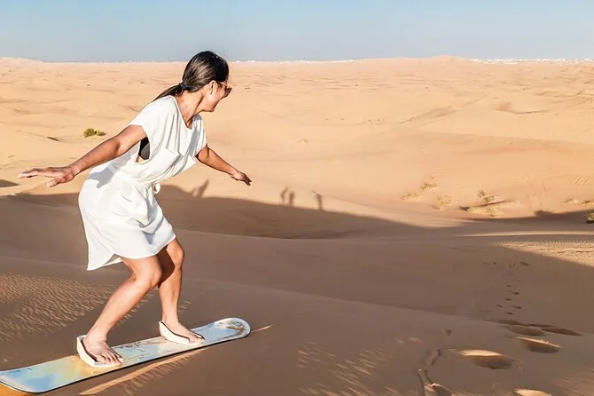 Dune bashing, sandboarding, breve giro in cammello, spettacoli di danza dal vivo, tatuaggi di henné per donne e bambini, cena a buffet BBQ.