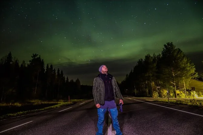 Alla terza notte avevamo già provato diversi posti intorno a Rovaniemi—luoghi che da soli non avresti mai trovato. Un rifugio nascosto aveva una vecchia panchina di legno vicino al lago; qualcuno aveva lasciato un thermos (ancora caldo). Sono quei piccoli dettagli che restano impressi. Anche se l’aurora non danza ogni sera, c’è sempre qualcosa nell’essere lì fuori—l’odore del fumo del nostro piccolo fuoco o semplicemente scambiare storie con gli altri che aspettano che il cielo si illumini.