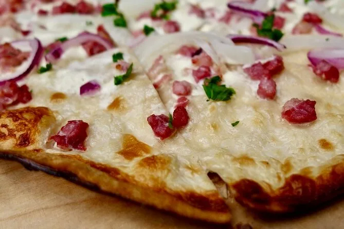 Dopodiché ci siamo addentrati a Friedrichshain, tra vecchi magazzini ricoperti di graffiti. Anna ci ha mostrato il suo murale preferito (un enorme gatto rosa — dice che c’è da quando era bambina). Prima tappa: Currywurst da un chiosco minuscolo, dove il ragazzo dietro al bancone mi ha chiamato “Schatz” quando ho fatto un po’ di confusione con l’ordine. La salsa era agrodolce, un po’ pasticciata ma deliziosa. Ho macchiato la manica di ketchup — a nessuno è importato. Poi abbiamo provato lo Schnitzel (croccante ai bordi, con una spruzzata di limone) e un Flammkuchen sfogliato dal sapore affumicato, appena uscito dal forno. Da un tavolo vicino si sentiva ridere; due anziani litigavano di calcio in tedesco. Ho capito forse tre parole.