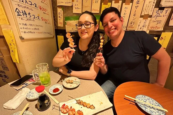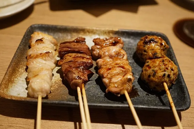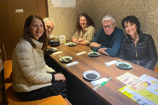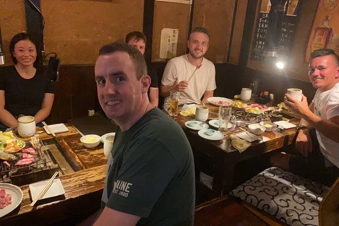 Dopo siamo usciti di nuovo nella notte, passando accanto a un vecchio che fumava sotto un’insegna tremolante. La seconda izakaya era più rumorosa — fumo di yakitori ovunque, gente che gridava ordini a squarciagola. La guida ci ha mostrato come ordinare gli spiedini di pollo “shio” o “tare” (io ho scelto entrambi), e onestamente? Avrei potuto restare lì tutta la notte a guardare i cuochi girare gli spiedini con quelle mani veloci. Qualcuno mi ha passato un drink che sapeva allo stesso tempo di prugna e fuoco. Tutto si è mescolato nel modo migliore — cibo, risate, nuovi amici che forse non ricorderanno il mio nome ma sicuramente la mia giapponese stentata.