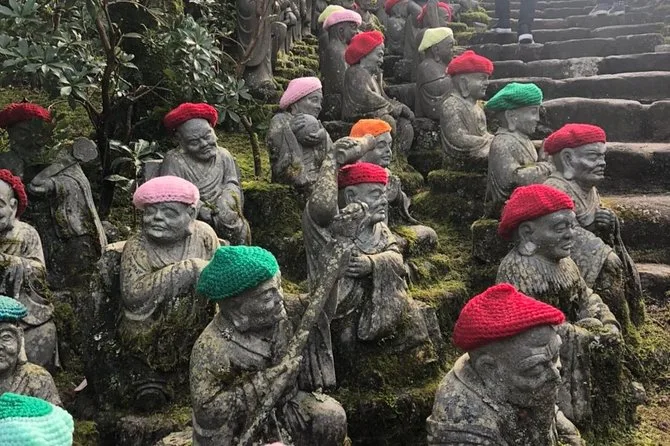 Il Tempio Daishoin era silenzioso—quasi troppo dopo la folla del santuario. Abbiamo fatto girare le ruote di preghiera (ancora non so se l’ho fatto nel modo giusto) e ascoltato Yuki che raccontava la storia del Buddhismo Shingon a Miyajima. Le statue avevano volti sereni, e qualcuno aveva messo loro dei piccoli cappellini rossi fatti a maglia. C’è stato un attimo in cui la luce colpiva i gradini coperti di muschio e tutto sembrava brillare di verde—me lo ricordo ancora.