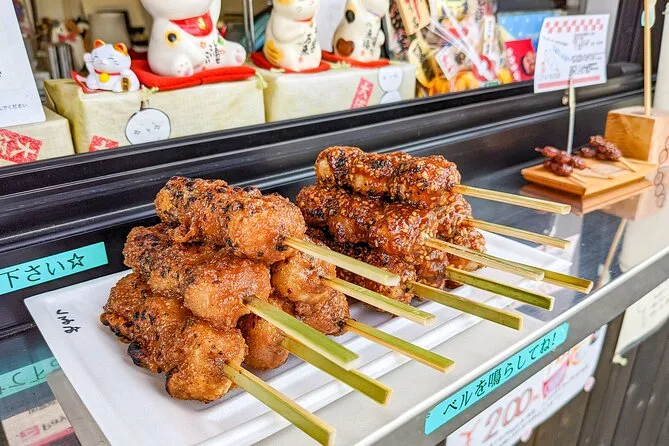 Il tour include cinque assaggi di street food tipico — come miso kushi katsu, gohei mochi, pollo karaage, tenmusu e panini al vapore — più la lettura della fortuna con gli omikuji in un santuario locale. Una guida amichevole ti accompagnerà per le strade animate di Osu, raccontandoti storie e curiosità così potrai goderti ogni assaggio senza preoccuparti di perderti o di non scoprire i posti nascosti.
