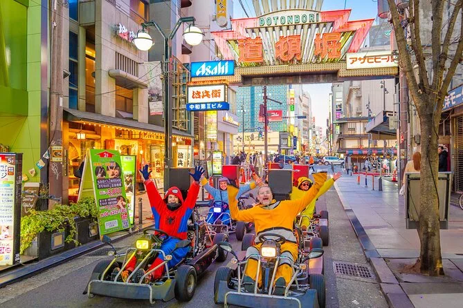 Guida un go kart travestito dal tuo personaggio preferito per le strade vivaci di Osaka, passando per il caos di neon di Dotonbori e la Torre Tsutenkaku, mentre i locali ti salutano e ridono. Include noleggio costume, assicurazione, carburante e tutte le attenzioni che puoi sopportare. Ricorda solo: porta la patente internazionale valida o non potrai guidare.