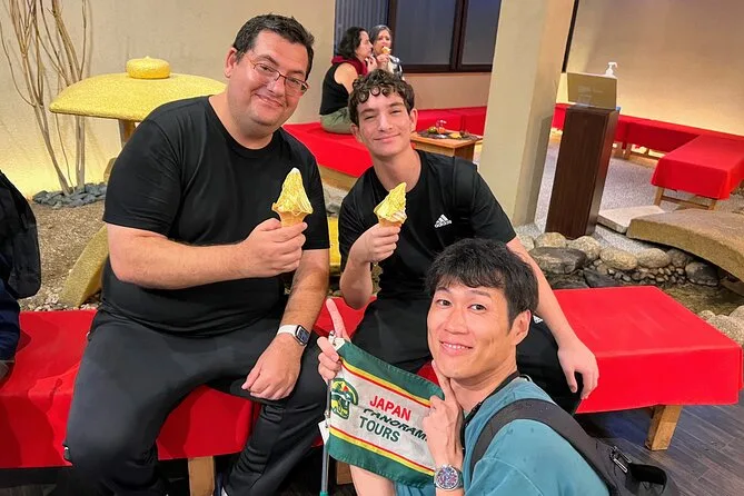 Poi abbiamo incontrato un artigiano del wagashi che ci ha mostrato come modellare la pasta di fagioli dolci a forma di fiore. Il mio tentativo sembrava più una patata che una camelia—lui ha riso e ha detto “la pratica rende perfetti”. Alla fine avevamo le dita appiccicose e qualche parola nuova in giapponese (Li ha riso quando ho provato a pronunciarle). Dopo è arrivata l’esperienza della foglia d’oro—sottili scaglie ovunque, anche sulla manica. Non sapevo si potesse mangiare l’oro finché non mi hanno dato un gelato soft servito con una spolverata d’oro nel quartiere Higashi Chaya. Era elegante ma anche un po’ buffo allo stesso tempo.