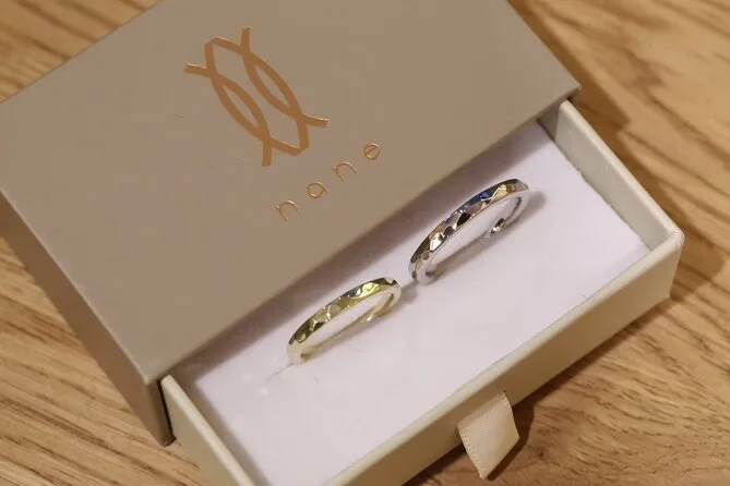 L’ambiente sembrava lo studio di un artigiano di una volta—tavoli da lavoro segnati, piccoli vassoi con pezzi di rame e argento ovunque. C’era un’altra coppia che stava facendo anelli abbinati; continuavano a sussurrare e ridacchiare ogni volta che uno sbagliava. Mi è piaciuto poter scegliere tutto: larghezza, materiale, persino la brillantezza finale. Quando Yuki ha lucidato il mio anello all’ultimo passaggio, me l’ha fatto tenere sotto una lampada forte per farmi vedere tutti i piccoli segni che avevo lasciato. Non era perfetto—c’è un punto dove ho colpito troppo forte—ma proprio per questo lo adoro.