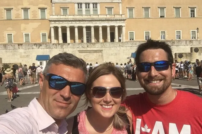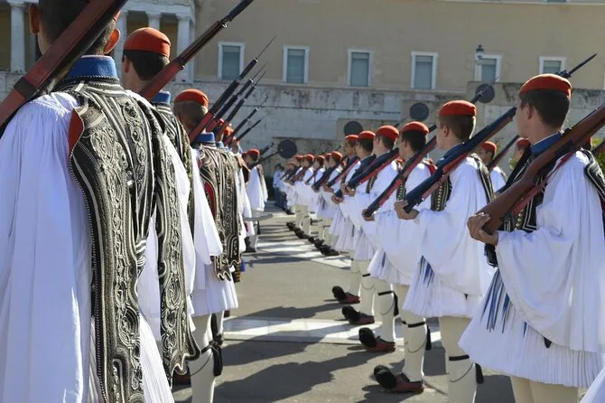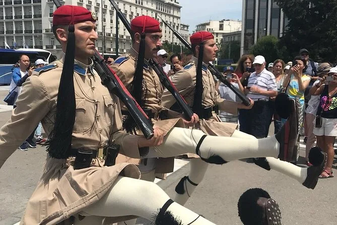 Dopodiché abbiamo zigzagato oltre l’Arco di Adriano e ci siamo fermati al Tempio di Zeus Olimpio — quelle colonne sono incredibilmente alte da vicino. Ho provato a immaginare com’era con tutte le statue, ma la mia mente tornava sempre al silenzio che regnava in un posto così affollato. Poi siamo arrivati a Piazza Syntagma, dove abbiamo assistito al cambio della guardia degli Evzones davanti al Monumento al Milite Ignoto. Le loro scarpe hanno dei grandi pompon; non pensavo che quel dettaglio potesse emozionarmi così o darmi una strana sensazione di conforto. Yannis ci ha raccontato di suo nonno che lo portava qui la domenica — rideva ricordando come cercasse di imitare il loro passo.