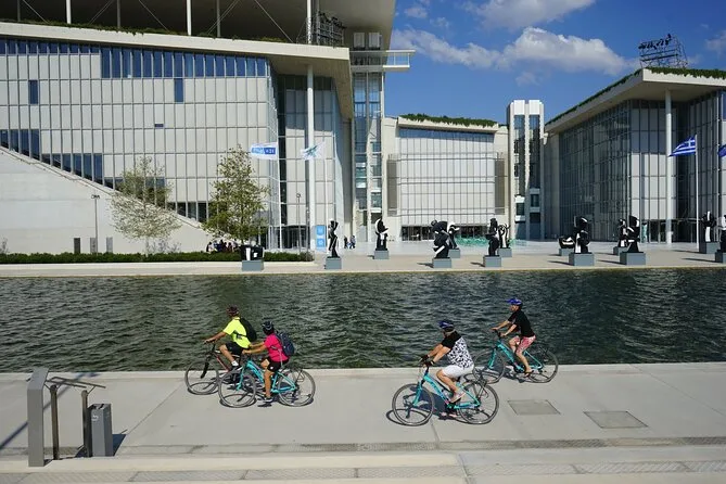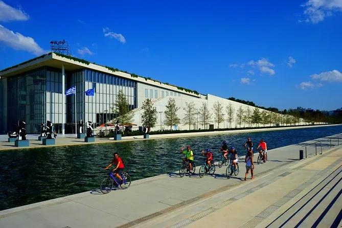 La pedalata è diventata più veloce lasciando il centro, passando davanti al Cine Thision (un cinema all’aperto dal 1935 — chi lo sapeva?) e poi su piste ciclabili vere verso il mare. Il Centro Culturale Stavros Niarchos si è alzato davanti a noi tutto di vetro e con il tetto verde, un’atmosfera completamente diversa dagli antichi resti ma che in qualche modo ci stava bene. Alla Marina di Flisvos gli yacht ondeggiavano accanto a una corazzata che sembrava pronta a salpare se qualcuno glielo avesse chiesto gentilmente.