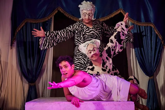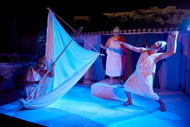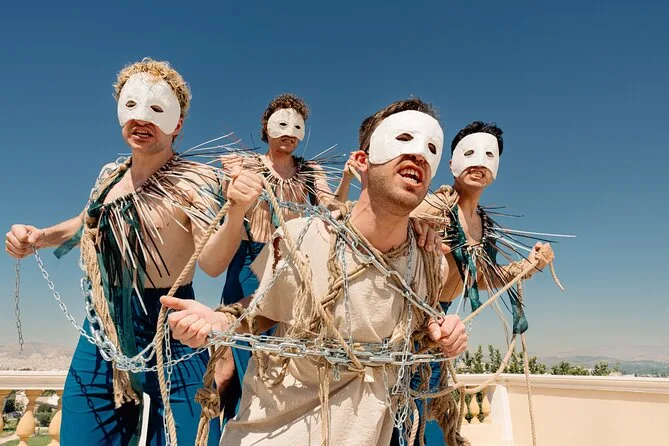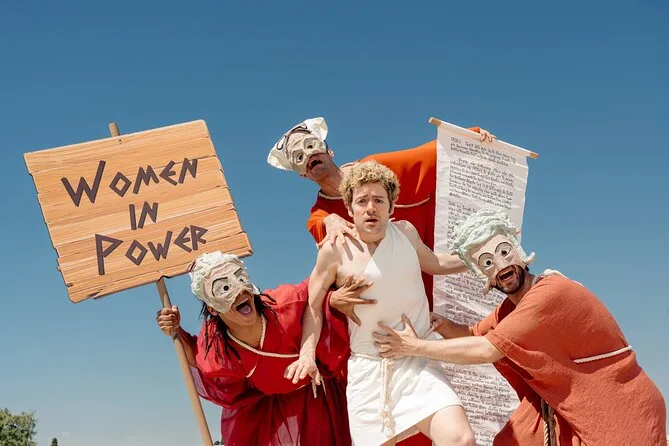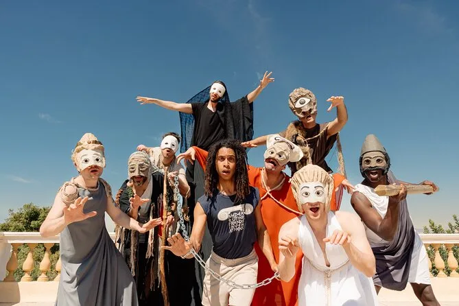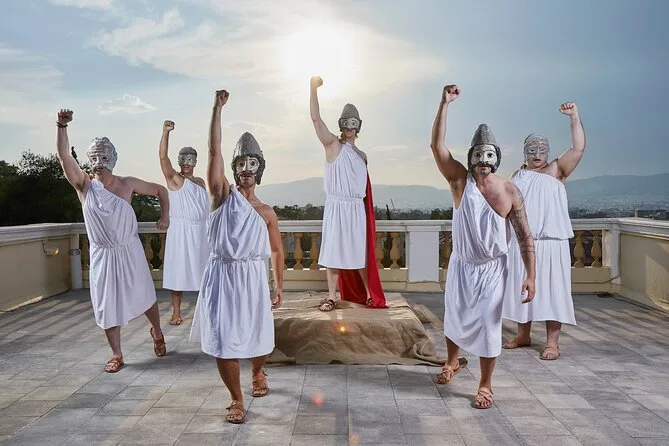 Prendi posto in un teatro all’aperto di Atene per uno spettacolo vivace di un’ora in inglese — miti antichi raccontati da attori locali che li rendono incredibilmente attuali. Sorseggerai un bicchiere di vino bianco offerto mentre il sole tramonta su Atene. Aspettati risate, piccoli colpi di scena e la sensazione di far parte della storia viva della città.