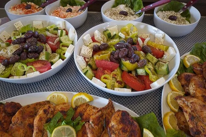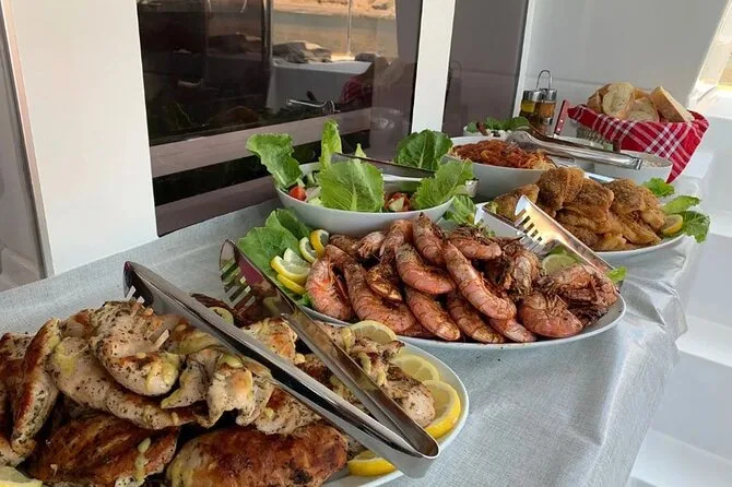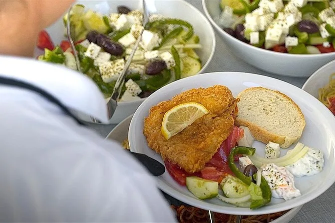 A bordo viene preparato un pranzo greco completo con pollo alla griglia, filetti di pesce, gamberi, pasta al pomodoro e basilico, insalate, salse, snack e pane.