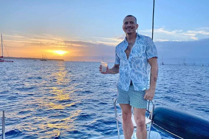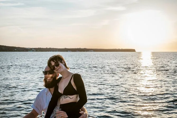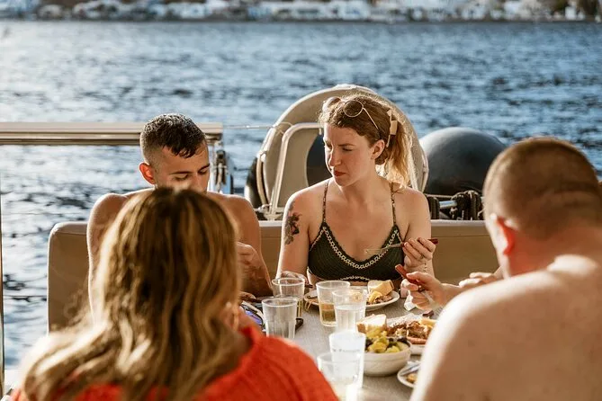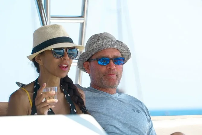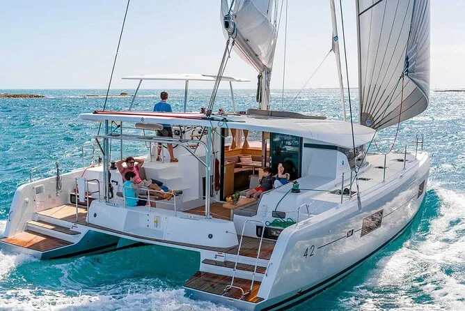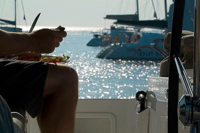 Non pensavo che il pranzo mi importasse così tanto, ma davvero? Il pollo alla griglia aveva quel sapore affumicato perfetto dopo il bagno. L’equipaggio passava piatti di gamberi e pasta al pomodoro e basilico — semplice, ma si sentiva il sapore del mare in ogni boccone. Il vino bianco scorreva abbastanza liberamente (con moderazione — ci tenevano d’occhio), e qualcuno era sempre pronto a riempire il bicchiere o a offrire un altro pezzo di pane. A un certo punto mi sono semplicemente rilassato, ascoltando la musica che si mescolava al rumore delle onde contro il catamarano, senza pensare a nulla se non a quanto fosse intenso quel blu tutto intorno.