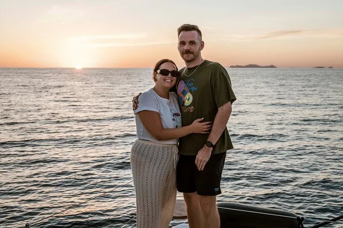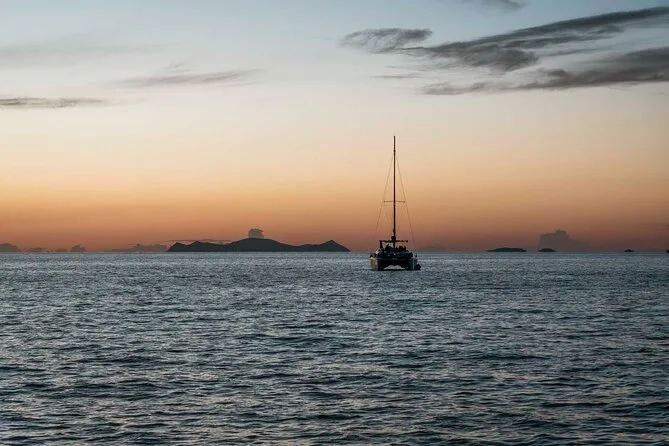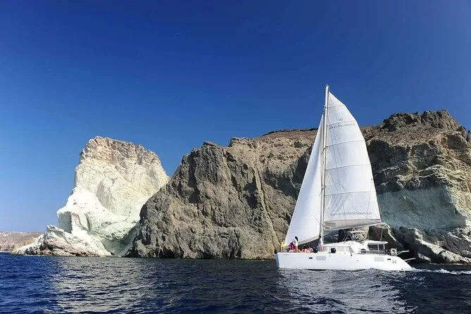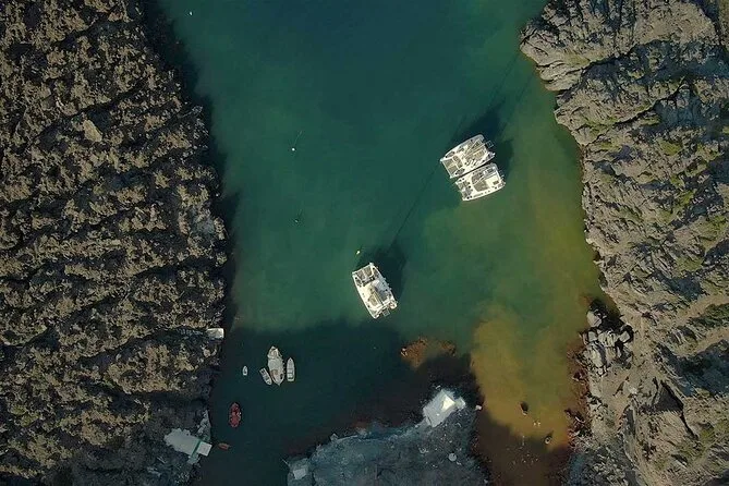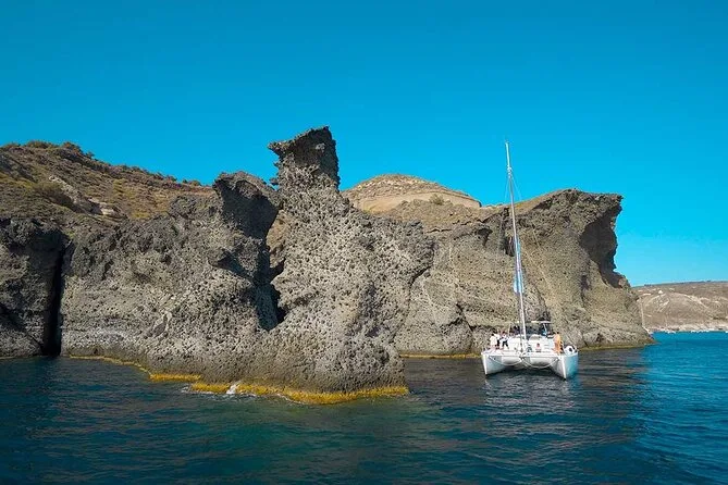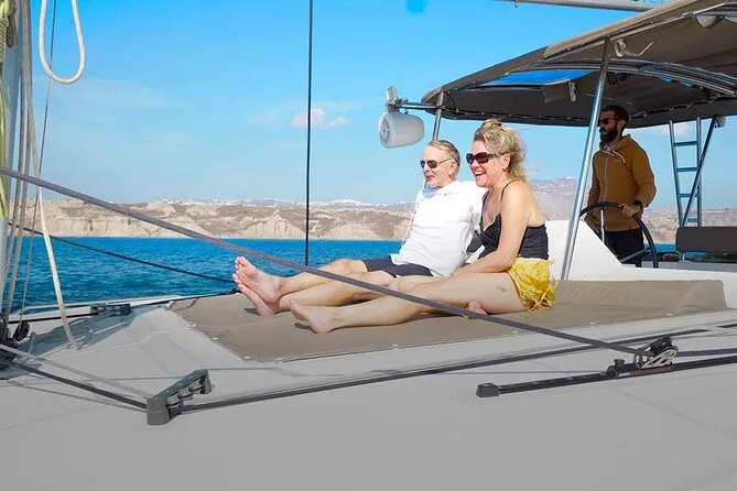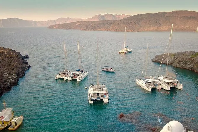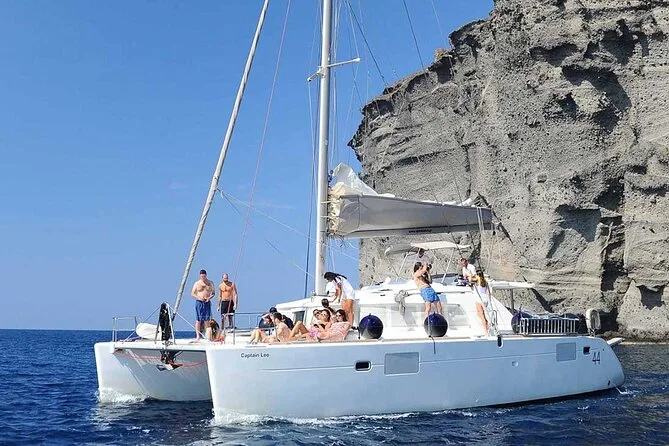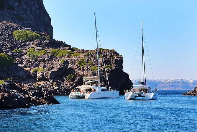 Salpa lungo la caldera di Santorini con una crociera in catamarano per piccoli gruppi, con soste per nuotare alle sorgenti vulcaniche e spiagge dal blu intenso. Gusta un pranzo BBQ greco con pesce fresco e vino locale a bordo mentre osservi le case bianche di Oia illuminarsi al tramonto. Include trasferimento da/per hotel e tutte le bevande — porta solo il costume (meglio se scuro!).