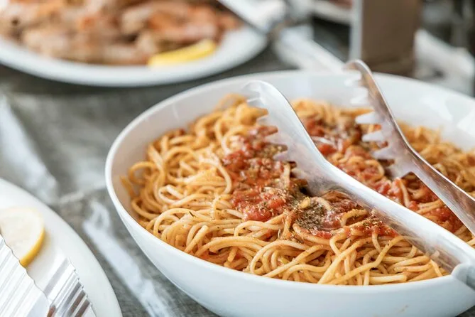 Il tuo giorno include il trasferimento da e per l’hotel (o punto d’incontro al porto), tutti i servizi della barca con bagni e spogliatoi su un comodo catamarano con musica soft in sottofondo. Riceverai un asciugamano a persona più bevande analcoliche illimitate o acqua, insieme a vino bianco o birra greca offerti entro limiti sicuri. Il pranzo prevede pollo BBQ appena grigliato o piatti vegetariani di pasta con insalate e snack, mentre ti rilassi tra un bagno alle sorgenti vulcaniche o a Red Beach prima di tornare al tramonto.