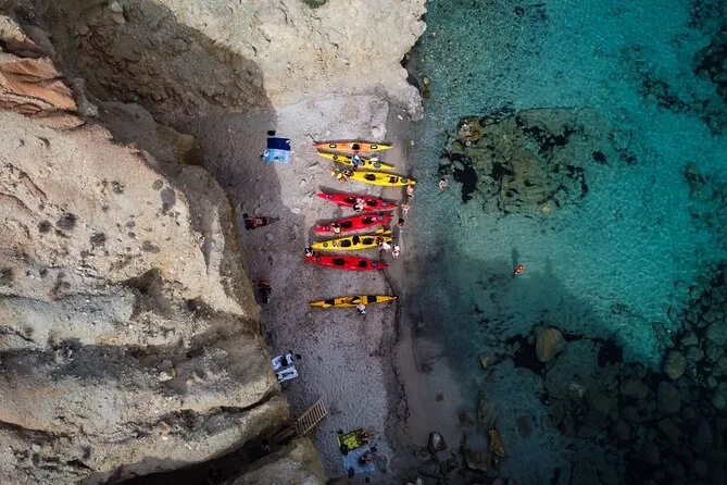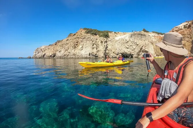 Il tuo giorno include kayak a doppio posto con timone, giubbotti salvagente forniti a Firopotamos Beach, una borsa impermeabile per i tuoi effetti personali e una GoPro per kayak (se vuoi foto mosse come le mie), maschera e boccaglio per lo snorkeling nelle grotte, snack tradizionali fatti in casa durante le pause—più una custodia impermeabile per il telefono così puoi scattare foto senza paura di farlo cadere in acqua.