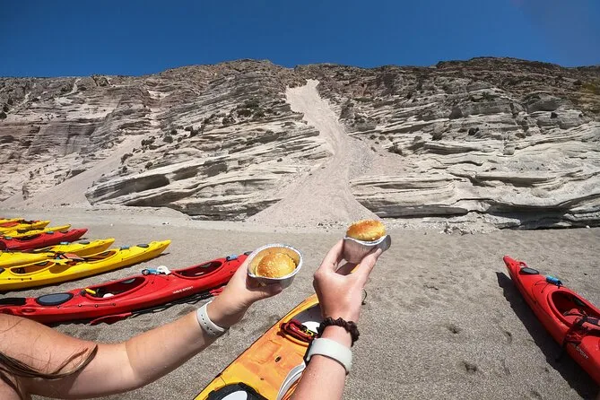 Il tratto fino a Gerakas durò un po’ di più (le mie braccia ancora protestano), ma vedere quelle cascate di sabbia scivolare sulle rocce vulcaniche bianche? Valeva ogni sforzo. Le sorgenti termali di Gerakas erano delicate—bisognava muovere le dita nella sabbia per sentire quel leggero tepore. Restammo a galleggiare ascoltando solo l’acqua che schiaffeggiava i kayak. Il pranzo era semplice: torta di feta e olive, mangiate seduti sulle rocce calde con il sale ancora sulla pelle. Niente di elegante, ma perfetto dopo tutto quel remare.