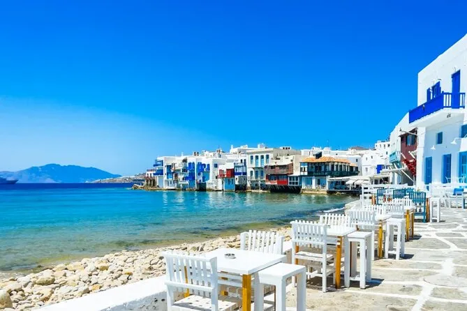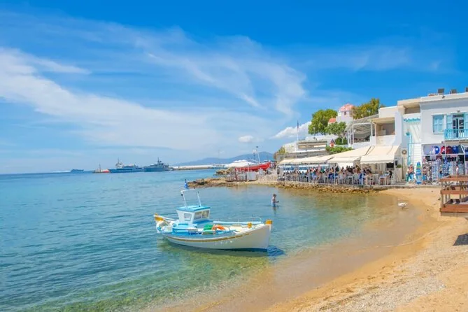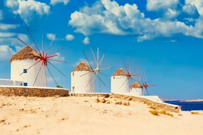 Visiterai la spiaggia di Kalafatis, la piazza del villaggio di Ano Mera, i mulini a vento di Mykonos (Kato Mili), Piccola Venezia e la chiesa di Paraportiani.