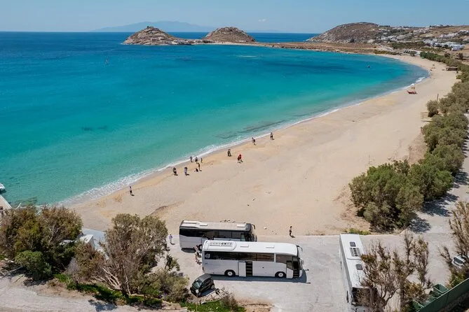 Il tuo tour di mezza giornata prevede spostamenti in bus climatizzato intorno all’isola di Mykonos con una guida locale in inglese che ti accompagnerà sia durante i tragitti in veicolo sia a piedi. Visiterai la spiaggia di Kalafatis per qualche foto, farai una passeggiata nella piazza del villaggio di Ano Mera circondata da taverne tradizionali (cibo non incluso), vedrai luoghi iconici come Piccola Venezia e la chiesa di Paraportiani in città—tutto con partenza dal terminal bus del Porto Vecchio vicino alla fermata del sea-bus, per poi tornare in autonomia.