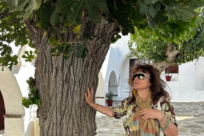 La tappa successiva è stata Piccola Venezia—i suoi balconi quasi sospesi sull’acqua. Sentivo il tintinnio di piatti da un bar che stava appena aprendo. Poco lontano, i mulini a vento scricchiolavano al ritmo della brezza. Li avevo visti in foto, ma dal vivo sono più ruvidi e imponenti di quanto immaginassi. Dopo siamo saliti su un van e abbiamo attraversato campi punteggiati di capre (una mi ha fissato così a lungo che ho iniziato a ridere). Il monastero di Ano Mera era fatto di marmo e incenso; Eleni ci ha mostrato come riconoscere le pietre più antiche del cortile—sembrava davvero orgogliosa di quel posto.
