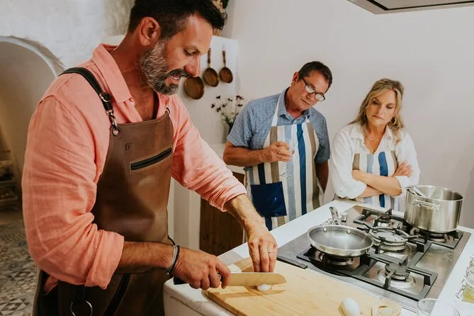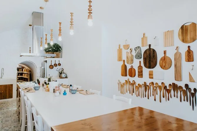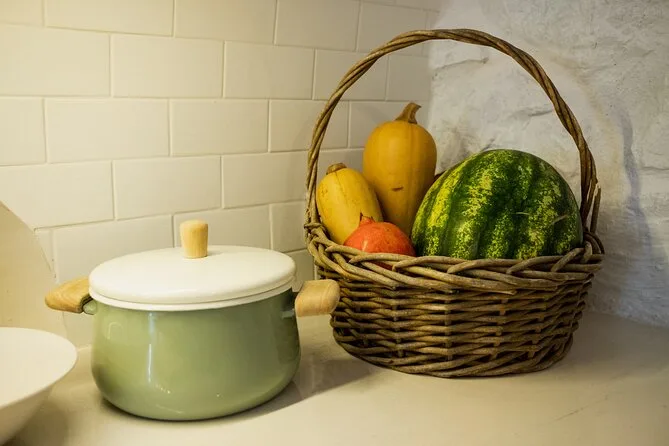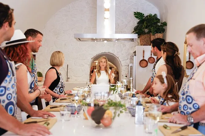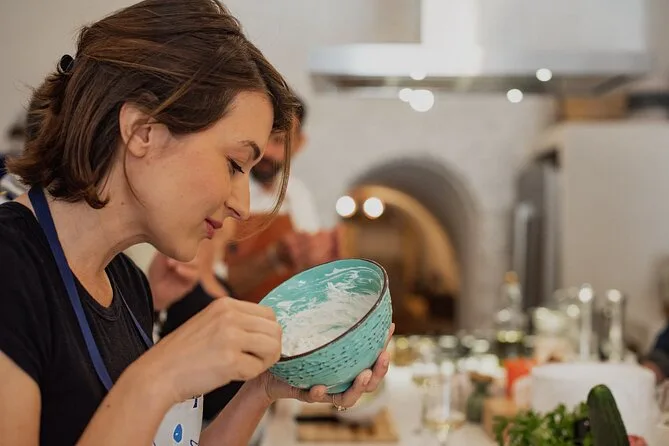La giornata comprende antipasti e vino locale all’arrivo, tutti gli ingredienti e gli strumenti per cucinare piatti greci con le mani guidati da locali dentro una casa grotta di Santorini, un pasto completo in terrazza con vino o bevande analcoliche, dessert e caffè greco finale, più un ricettario personale da portare a casa.