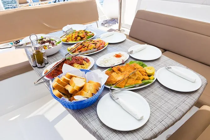 Il tuo giorno include il trasferimento in minibus climatizzato da qualsiasi punto di Santorini, più tutte le tasse già pagate. A bordo avrai asciugamani e attrezzatura per snorkeling da usare quanto vuoi. Il pranzo è un ricco BBQ greco con specialità locali — gamberi, pollo, salsicce, insalate — e un open bar con vino bianco, birra e bevande fino al ritorno al porto di Vlychada.