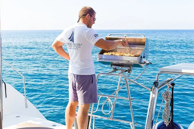 Naviga tra scogliere rosse, tuffati alle sorgenti termali, assapora un BBQ greco nel Mar Egeo
