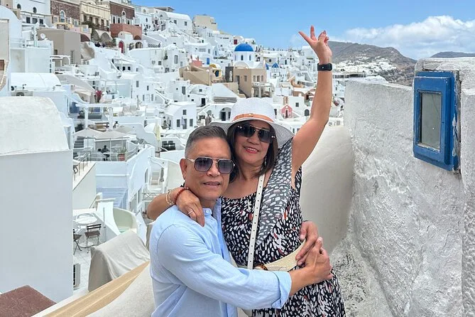 Non pensavo di sentirmi così emozionata scendendo dalla funivia a Fira, ma vedere da vicino le scogliere di Santorini mi ha fatto battere il cuore un po’ più forte. La nostra guida, Maria, ci ha accolto con un sorriso rapido—aveva quella voce che ti fa sentire subito in buone mani. Il minibus era fresco dentro (per fortuna), e mentre attraversavamo Firostefani, mi ha fatto notare la chiesa con la cupola blu prima ancora che la vedessi da sola. L’aria aveva un leggero profumo di salsedine, mescolato a qualcosa di dolce che non riuscivo a identificare—forse bouganville? Ci siamo fermati per qualche foto e ho provato a scattare quella foto da cartolina di cui tutti parlano. La mia è venuta un po’ storta, ma in realtà così sembrava più autentica.