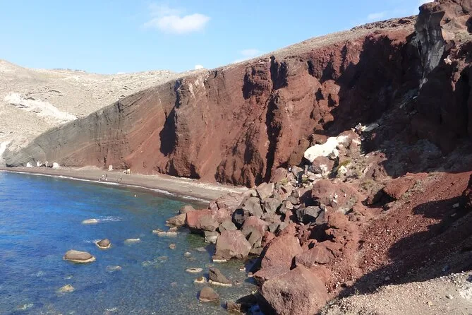 La tappa successiva è stata la Spiaggia Rossa, che è davvero rossa — non è un trucco di Instagram. La sabbia si attacca ai piedi come zucchero caldo e c’è un odore pungente delle rocce vulcaniche che cuociono al sole. Alcuni facevano il bagno, ma noi ci siamo solo tolti le scarpe per un po’, lasciando che le dita affondassero nella sabbia nera più tardi a Perissa (si scalda in fretta — non fare come me che ho corso sopra!). Il pranzo era opzionale, ma non abbiamo resistito; polpo alla griglia vicino al mare mentre i gabbiani litigavano sopra di noi. C’è qualcosa nell’insalata greca qui che ha un sapore diverso — forse è solo la fame dopo tutta quella camminata.