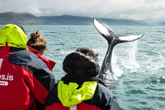 Partirai da Hauganes con una guida locale per esplorare le acque selvagge di Eyjafjordur, alla ricerca di megattere, delfini e uccelli marini. Ascolta le storie dal vivo del capitano pescatore, gusta un caffè caldo sul ponte e senti l’aria pura dell’Islanda sulla pelle. Se sei fortunato, le balene si avvicineranno così tanto da farti dimenticare tutto il resto per un attimo.