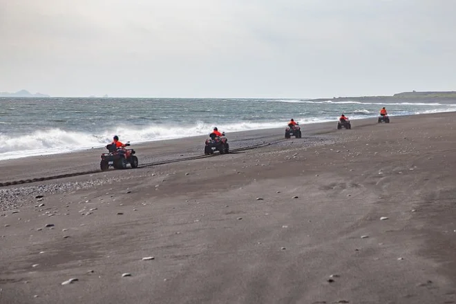 Siamo partiti piano, attraversando piccoli fiumi dove l’acqua mi bagnava gli stivali e faceva ondeggiare il quad più di quanto pensassi. La sabbia nera era più morbida di quanto sembrasse, quasi come guidare su fondi di caffè compattato. Jón indicava tutto — “Questa è opera di Katla,” diceva parlando di quella distesa infinita di sabbia scura, poi scherzava sui troll che vivono sulle montagne (credo fosse mezza battuta). Quando ci siamo fermati sulla costa, ho sentito l’odore di sale e qualcosa di quasi metallico nel vento. Guardando il ghiacciaio alle spalle, con Dyrhólaey che spuntava in lontananza… è difficile da spiegare. Dita fredde, il rombo caldo del motore sotto di me, restare fermi per un attimo e godersi il momento.