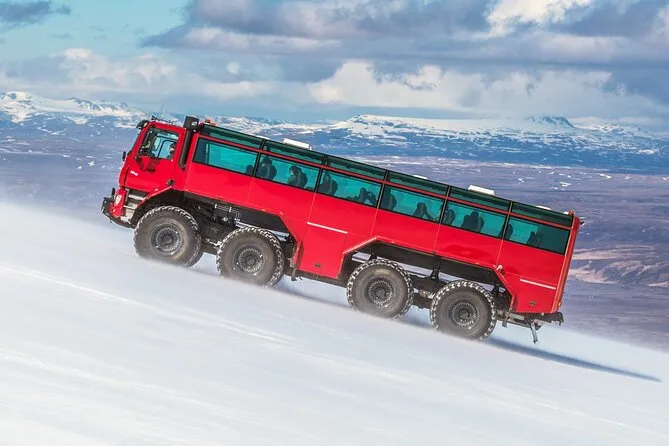 La giornata include il trasferimento da Gullfoss con bus Highland, poi il grande monster truck Sleipnir fino al ghiacciaio Langjökull; guida esperta locale; WiFi a bordo; bevande calde come cioccolata o tè e acqua pura del ghiacciaio; dolci tradizionali Kleinur; uso di ramponi se necessario; servizi igienici a bordo; e possibilità di provare slittino o golf sul ghiaccio a seconda del meteo—tutto prima di tornare a Gullfoss, da dove sei partito.