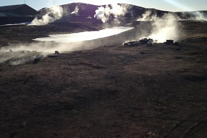 Ho scelto l’opzione delle Nature Baths — se fai un’escursione di un giorno da Akureyri al Lago Myvatn, tanto vale godersela fino in fondo. Il vapore qui è diverso da qualsiasi altro posto dove sono stato; sa leggermente di uova (zolfo, ha detto Li), ma dopo cinque minuti non lo noti più. C’è una sorta di alone blu sopra tutto e la gente galleggia in silenzio, tranne un locale che cantava piano mentre sorseggiava un caffè dal bar. Se i bagni non fanno per te, alcuni del gruppo sono andati con un’altra guida a visitare la grotta di Grjotagja — a quanto pare c’è una fenditura dove puoi stare proprio dentro.