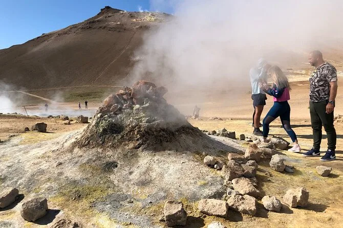 Il tuo giorno include trasporto in piccolo gruppo con pick-up e drop-off direttamente al porto di Akureyri, guida locale esperta in ogni tappa — dalla cascata di Godafoss ai campi di lava di Dimmuborgir fino alle pozze di fango di Hverir — più tempo alle Myvatn Nature Baths (ingresso non incluso) o alla grotta di Grjotagja, per poi tornare comodamente alla nave.