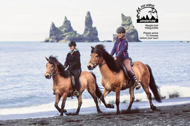 La tua esperienza include un’ora di cavalcata guidata su un cavallo islandese lungo la spiaggia di sabbia nera di Vik, con tutto l’equipaggiamento necessario come il casco fornito in scuderia prima della partenza.