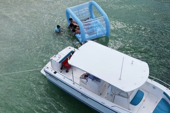La tua giornata include acqua in bottiglia per rinfrescarti, l’uso di una cabana galleggiante ombreggiata con speaker Bluetooth e frigorifero per le bevande, più un video 4K dal drone che cattura i tuoi ricordi dall’alto prima di tornare a riva con calma.