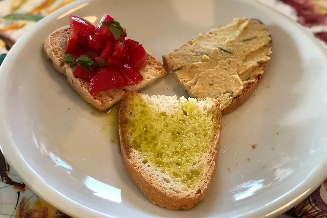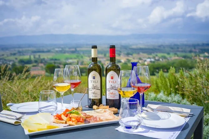 La visita include una degustazione guidata di quattro vini biologici abbinati a bruschette calde condite con olio d’oliva dell’azienda, una selezione di formaggi e salumi locali con marmellate fatte in casa, più tempo per passeggiare liberamente tra vigneti e uliveti vicino ad Assisi—per i bambini sono previste bevande analcoliche.