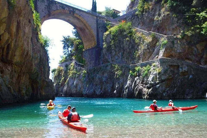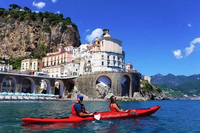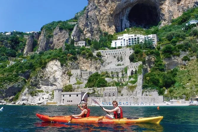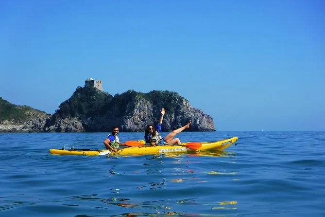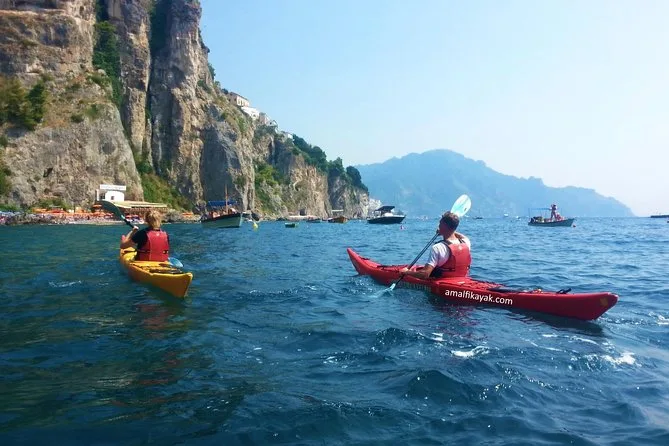 La giornata include tutta l’attrezzatura da kayak (kayak doppi, pagaie, giubbotti di salvataggio), giacche impermeabili e sacche per i tuoi effetti personali, attrezzatura da snorkeling per le spiagge nascoste, acqua in bottiglia per rimanere idratati, frutta fresca durante le pause, accesso a spogliatoi e bagni vicino al porto di Amalfi, deposito bagagli se necessario — oltre alle foto che ti invieremo dopo così non rischi di bagnare il telefono.