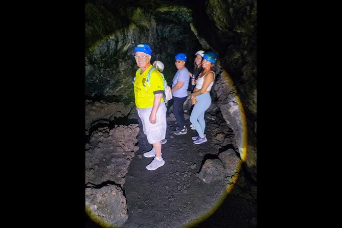 Si esplorano le pareti ondulate di lava all’interno della grotta con casco e torcia forniti dalla guida.