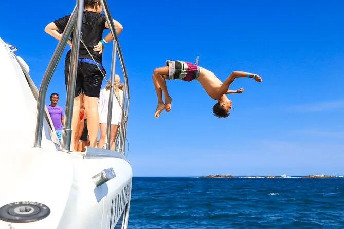 Il tuo giorno include il pick-up andata e ritorno dall’hotel a Cabo San Lucas, l’imbarco su un catamarano confortevole con tutta l’attrezzatura per lo snorkeling fornita. Potrai usare i paddleboard in due baie diverse, gustare un pranzo fresco con guacamole fatto in casa e panini, e bere a volontà dall’open bar prima di tornare rilassato a riva.