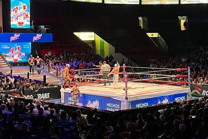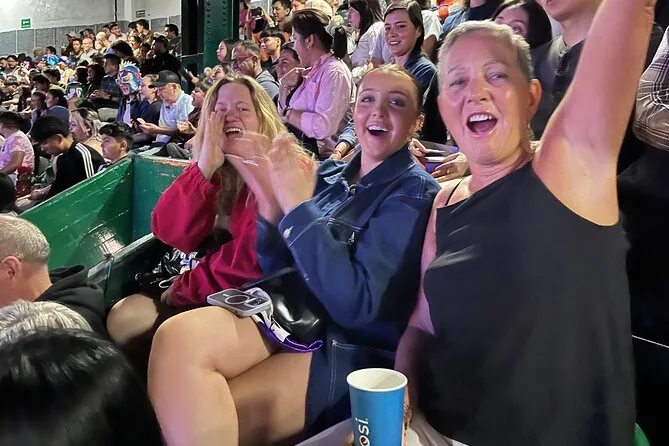 La tua serata include cena in una taquería popolare vicino all’Arena México con scelta di tacos e bevande (mezcal o birra per adulti; bevande analcoliche per tutti gli altri), biglietto d’ingresso allo spettacolo di lucha libre all’Arena México, guida esperta locale prima dell’ingresso e un divertente souvenir per ricordare sempre la tua notte a Città del Messico.