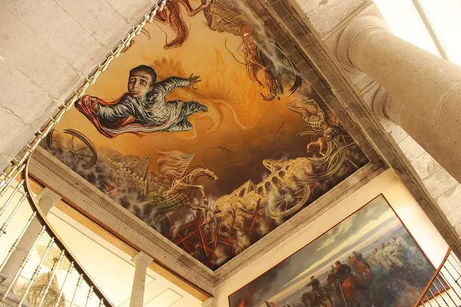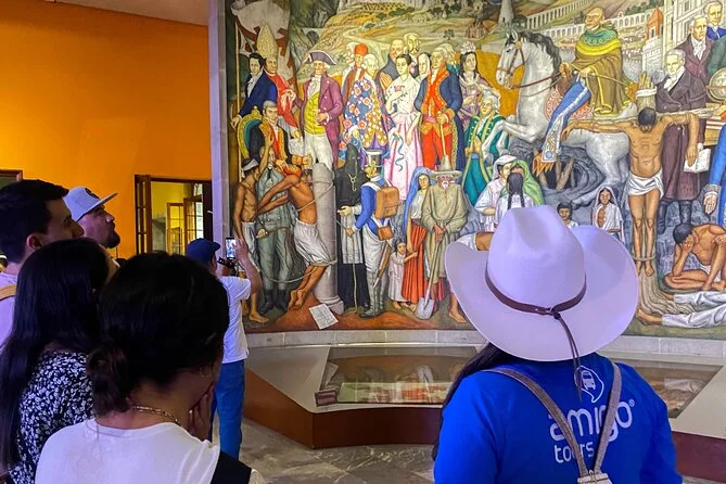 Mi fermavo spesso agli angoli solo per guardare la città dall’alto—la vista da lì è pazzesca, un cielo azzurro sfocato e un’infinità di tetti. In una stanza c’era un leggero odore di carta antica e lucidante; ho toccato un corrimano che probabilmente è stato stretto da presidenti e rivoluzionari (o forse solo da turisti stanchi). Abbiamo visto murales che coprivano intere pareti—battaglie, eroi, drammi—e Sofía si fermava per farci assaporare ogni dettaglio senza fretta. Ci ha parlato della spada di José María Morelos esposta, che mi ha davvero fatto venire i brividi. Non tutto mi è rimasto impresso alla perfezione, ma quel momento tranquillo a guardare la città mi è rimasto nel cuore, facendomi sentire piccolo ma in qualche modo connesso.