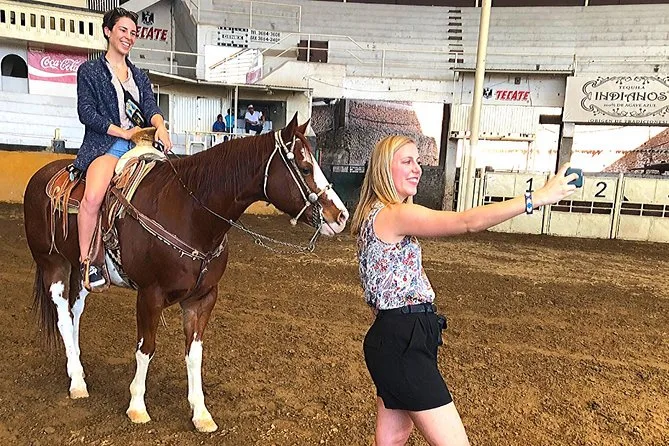 Poi è arrivata la parte che mi metteva più ansia: salire davvero a cavallo. Mi hanno dato un casco (non proprio tradizionale, ma sicuramente più sicuro) e mi hanno aiutato a salire—a quanto pare i cavalli sono più alti di quanto sembrino da terra. Cavalcare con quel cappello charro pesante era surreale; continuavo a pensare che sarebbe caduto, ma è rimasto al suo posto. Il sole era forte e tutto sembrava più vivido da lassù—sentivo il tintinnio degli speroni e qualcuno che canticchiava stonato nelle vicinanze. Dopo, ci siamo ritrovati tutti vicino al recinto per un brindisi con tequila (solo un sorso, promesso) mentre il mariachi suonava qualcosa di lento e dolce. Non mi aspettavo di sentirmi così parte di una tradizione così viva, anche solo per un pomeriggio.