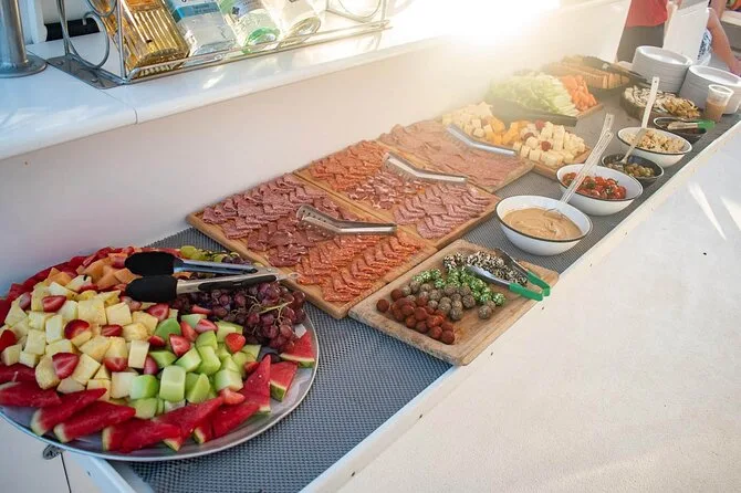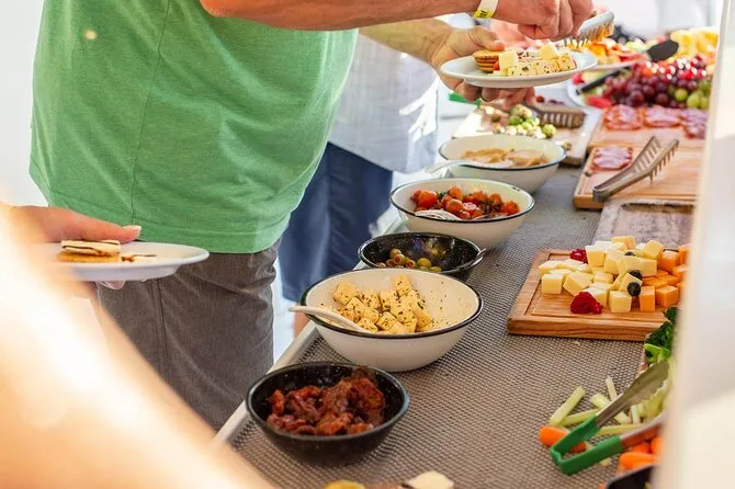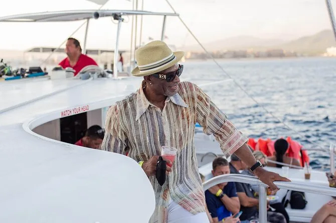 La tua serata include pickup e rientro in hotel a Los Cabos, oltre a birra, vino, liquori premium e bevande analcoliche illimitate durante la crociera al tramonto. Potrai gustare un buffet gourmet con salumi, formaggi, verdure con hummus, cracker e baguette, oltre a spiedini di frutta, per poi tornare comodamente in hotel dopo l’attracco a Playa Medano.