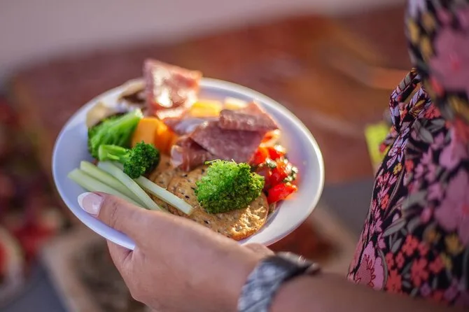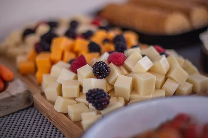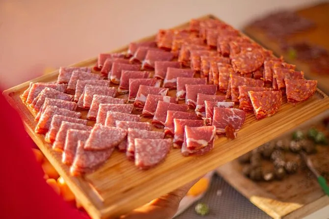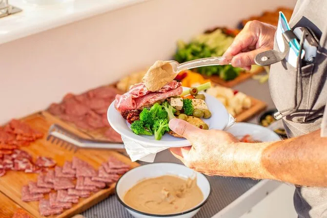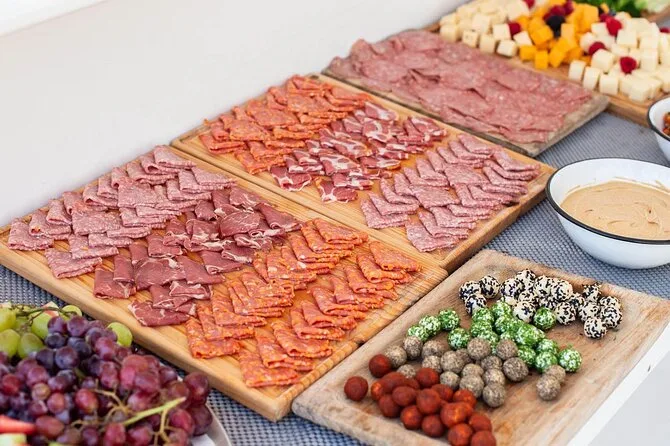 Avrai a disposizione un tavolo gourmet con salumi, formaggi, verdure, hummus, cracker, baguette, spiedini di frutta e uva fresca.
