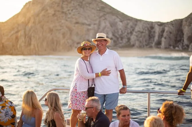 Durante la crociera al tramonto a Los Cabos passerai vicino a Pelican Rock e Playa del Amor con jazz rilassante e vino a volontà. Scatta foto all’Arco di Cabo San Lucas, gusta snack gourmet mentre il sole cala e lascia che l’equipaggio si occupi di tutto — dal pickup in hotel all’ultimo calice sotto il cielo del Pacifico.
